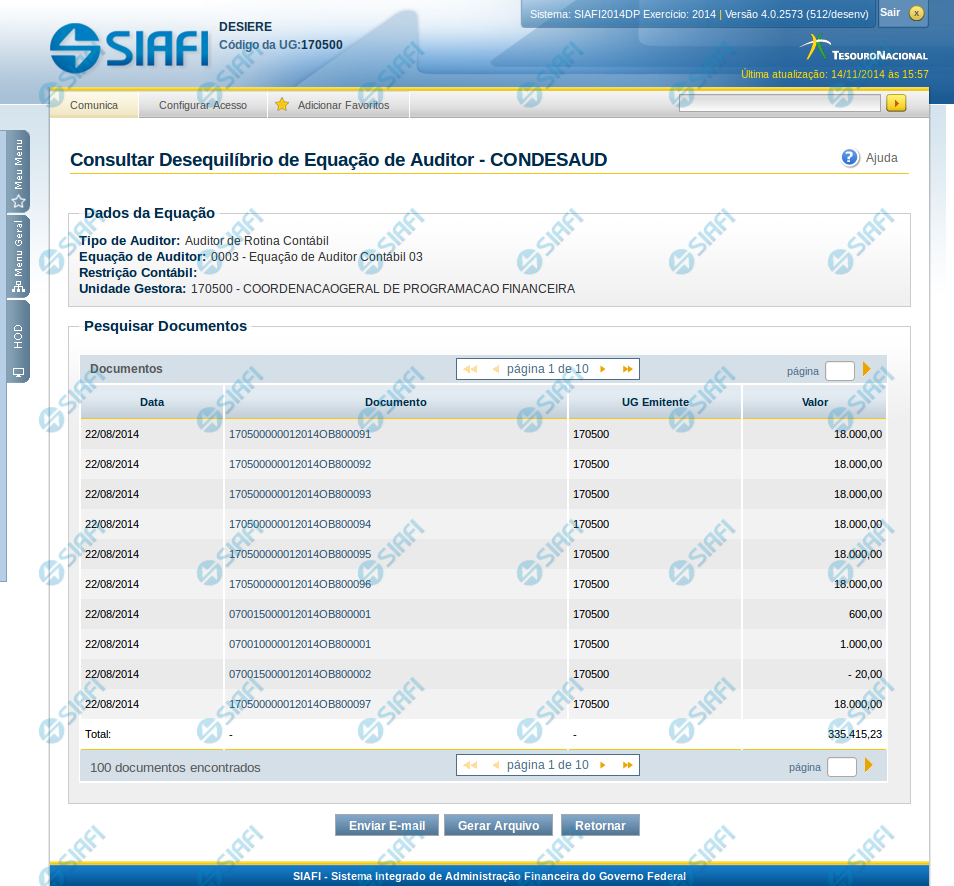 Esta tela apresenta uma lista de documentos possíveis de terem contribuído para o desequilíbrio detalhado.