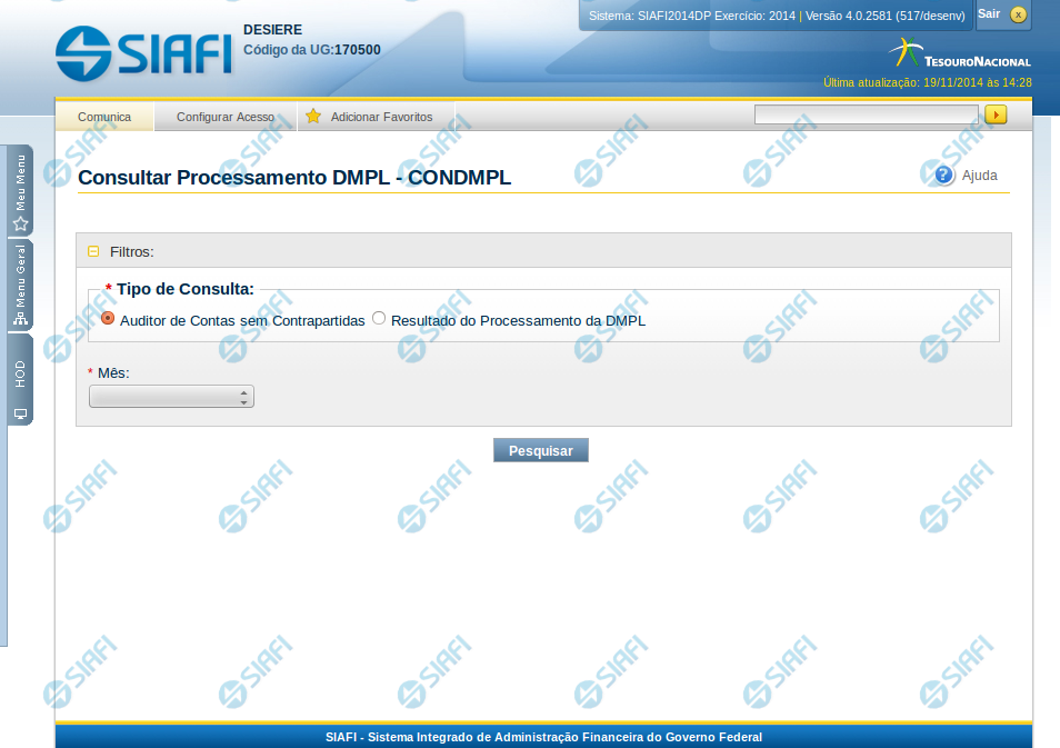Tipo de Consulta – informe o tipo de consulta que você deseja executar podendo ser: Auditor de Contas sem Contrapartidas ou Resultado do Processamento da DMPL.