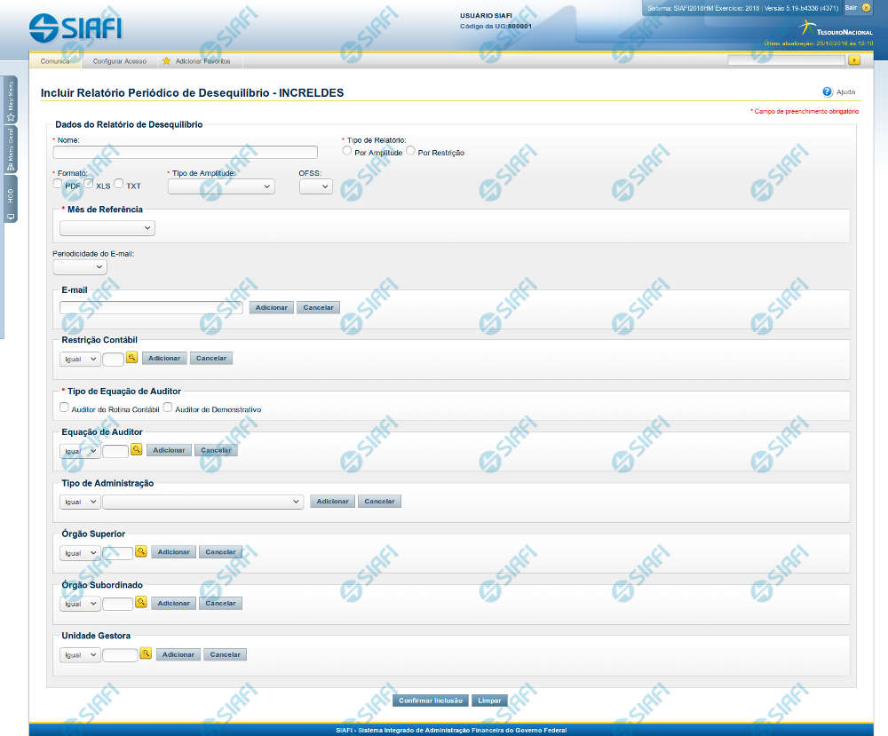 Confirmar Inclusão – Clique neste botão para confirmar a inclusão do relatório de desequilíbrio.