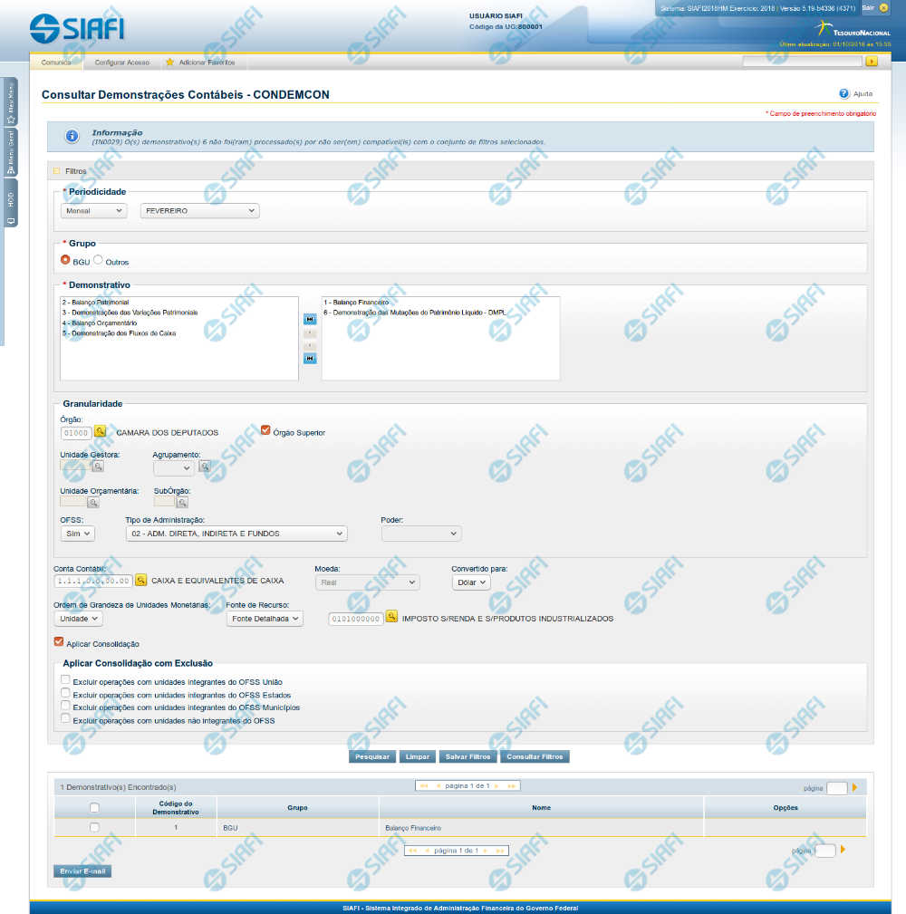 O acesso a essa funcionalidade pode ser feito diretamente pelo nome abreviado da transação: CONDEMCON. Para realizar a consulta dos demonstrativos contábeis, preencha os campos do bloco Filtros e clique no botão Pesquisar.