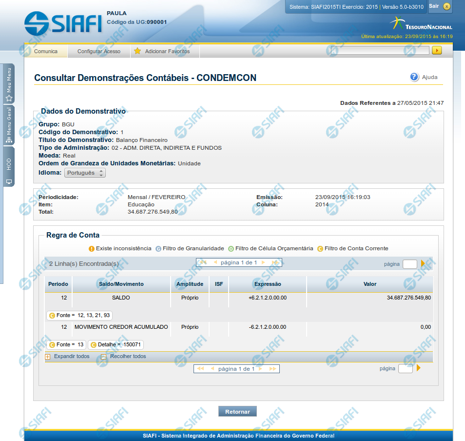 Moeda – indica a moeda escolhida para visualização dos valores do demonstrativo. Pode ser Real e Moeda de origem da UG.