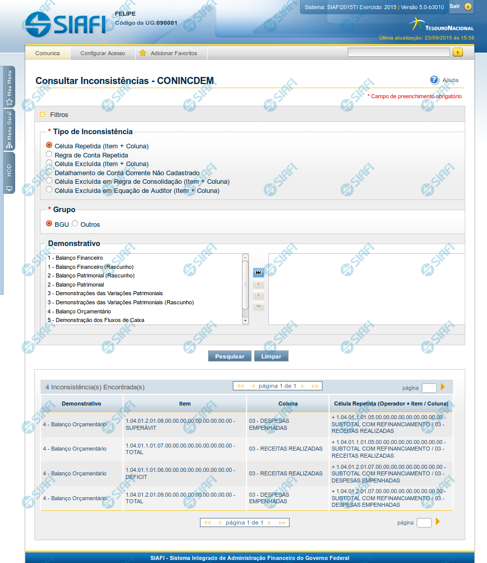 Grupo - informe o grupo de demonstrativo para o qual se deseja consultar as inconsistências.