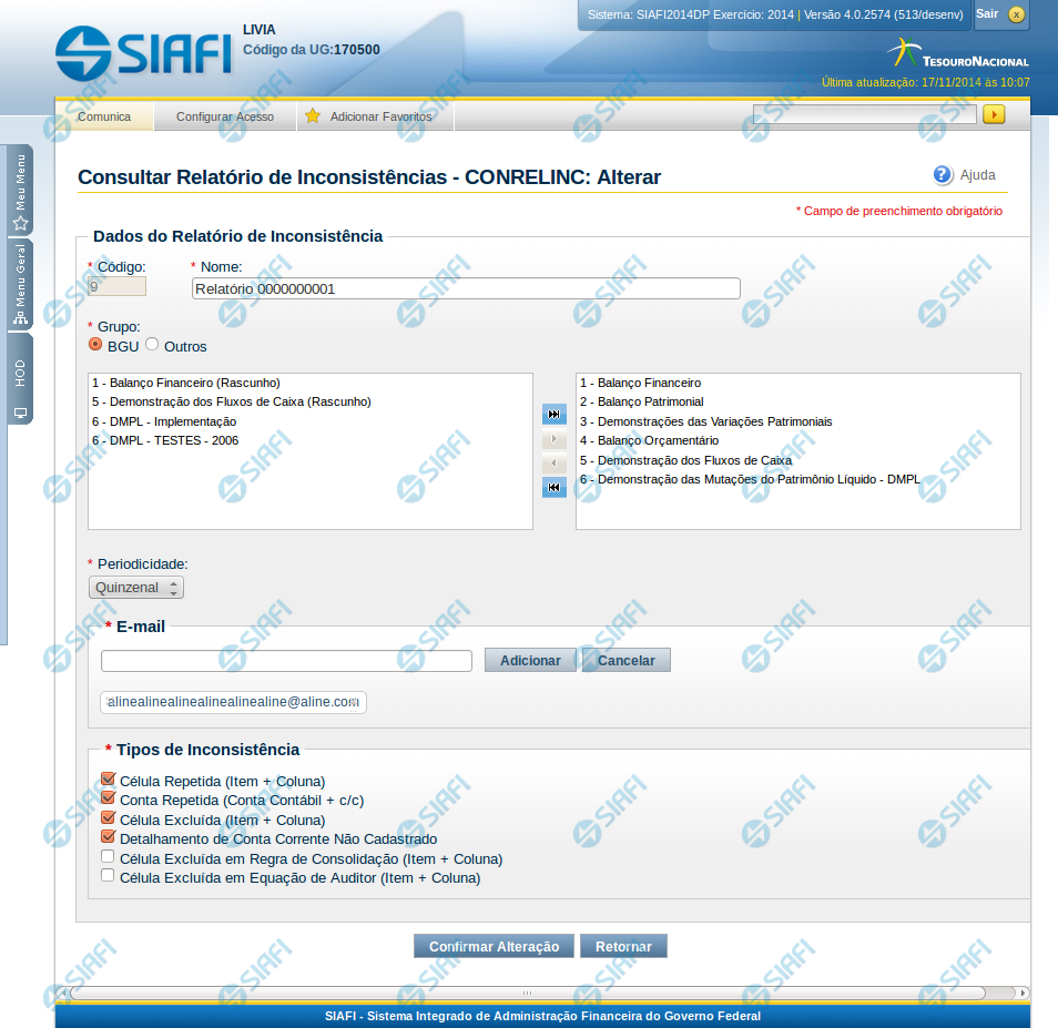 Periodicidade – selecione a periodicidade para o relatório de inconsistências.