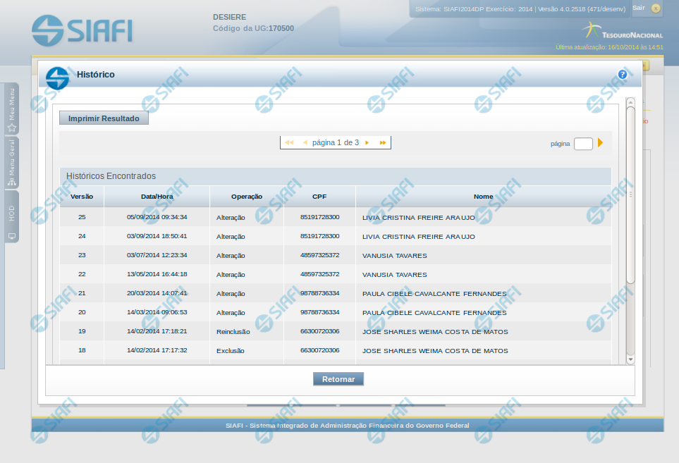 Esse formulário apresenta a lista de todos os processamentos efetuados sobre uma entidade. Selecione uma linha para detalhar a operação realizada.