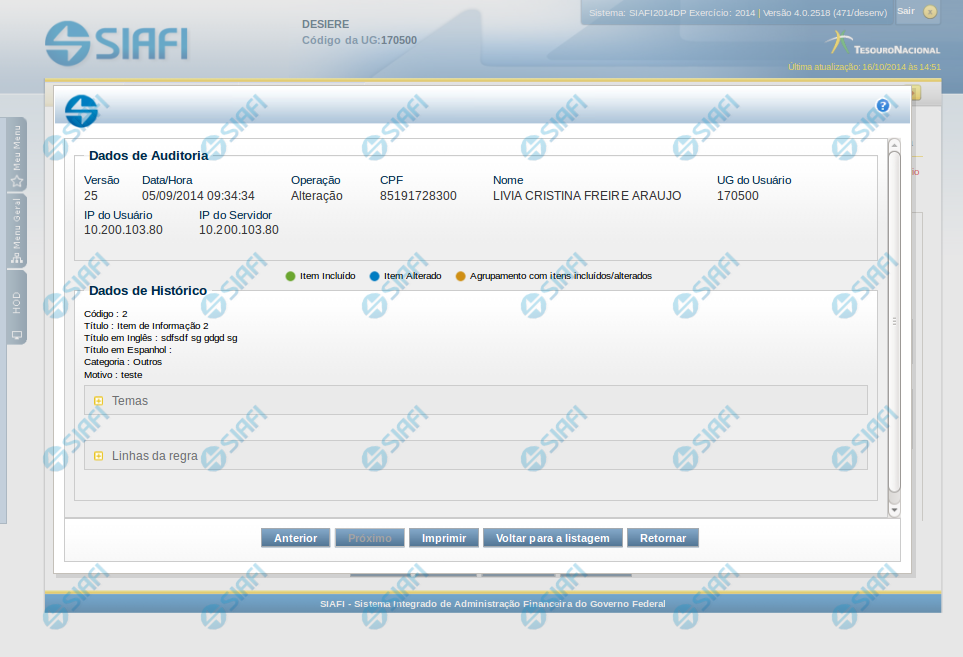 Nesta seção são listados os dados armazenados, para efeitos de auditoria, da entidade cujo histórico está sendo detalhado. Tais informações são capturadas automaticamente e registram dados do usuário logado no momento em que a operação sobre a entidade foi registrada e do computador a partir do qual tais operações foram realizadas.
