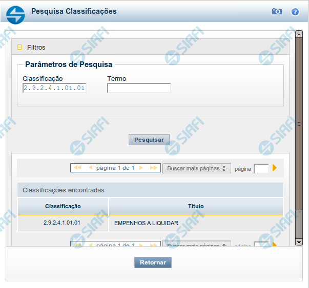 O resultado da pesquisa é uma lista de Classificações que atende aos parâmetros especificados. Clique em um campo dessa lista para selecionar o registro desejado.
