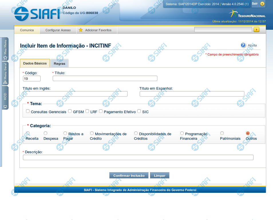 Incluir Item de Informação – Aba Dados Básicos – INCITINF