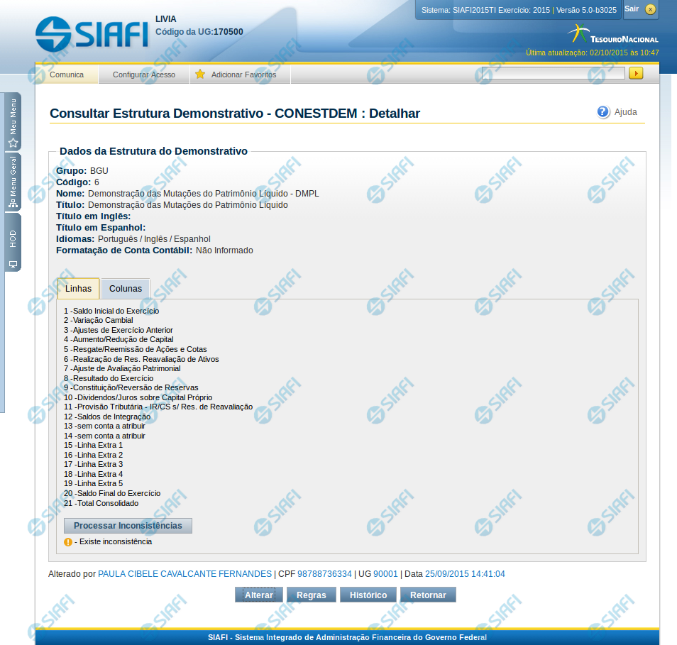Alterar – clique neste botão para alterar os dados do demonstrativo que está sendo detalhado. Esta é uma opção disponibilizada exclusivamente para os usuários cujo perfil permite a alteração dos dados dos demonstrativos.