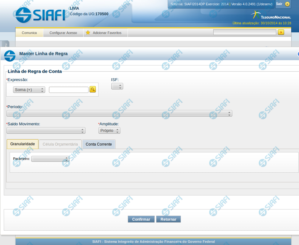 Retornar - Este botão será disponibilizado quando você selecionar para edição um parâmetro (de granularidade, conta-corrente ou célula orçamentária) já adicionado em uma das abas. Você deve clicar neste botão para desfazer a alteração do parâmetro editado.