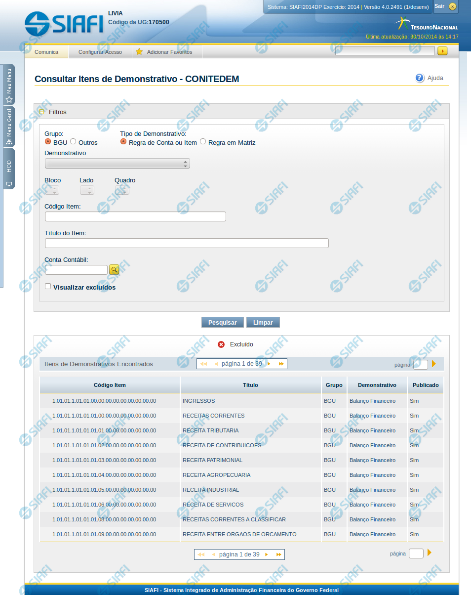 Lado – informe o lado do demonstrativo do item a ser pesquisado. Os valores disponíveis para seleção aparecem de acordo com a escolha do bloco no campo anterior.