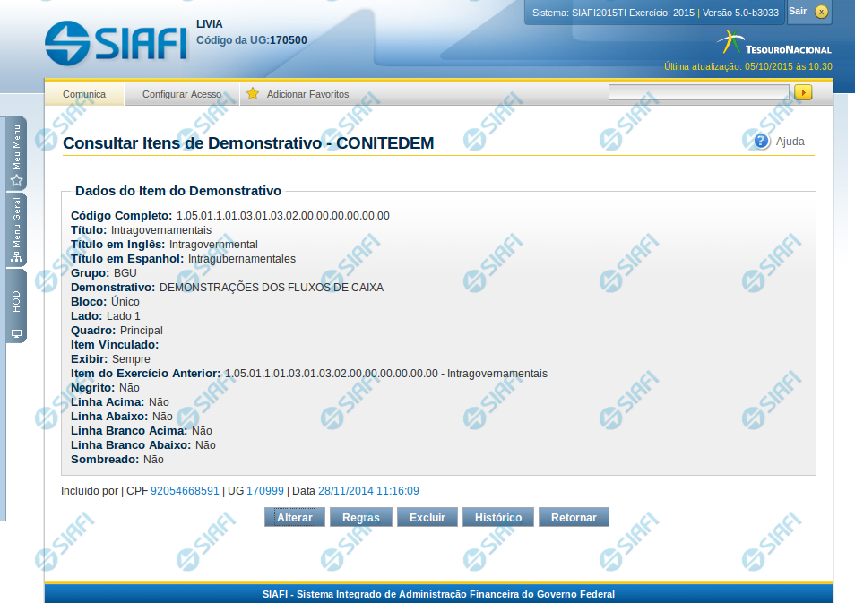 Nesta tela você pode visualizar os detalhes do item de demonstrativo, sem possibilidade de edição. Nesta página são exibidas as informações de auditoria, indicando a última edição do item, o responsável, data e UG.