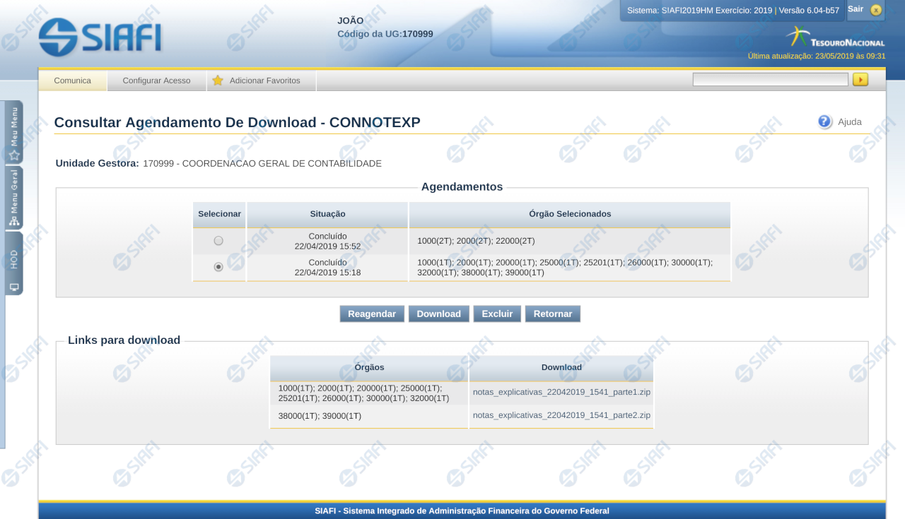Nesta tela você poderá consultar o status de todos os agendamentos de download de nota explicativa da UG do usuário logado.