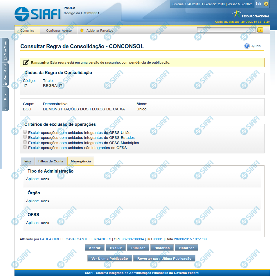 Nesta tela você pode visualizar os detalhes da regra de consolidação relacionados a Abrangência, sem possibilidade de edição. Nesta página, além dos campos disponibilizados na aba Abrangência, também são exibidas as informações de auditoria, indicando a última edição do item, o responsável, data e UG. Se a regra de consolidação detalhada não estiver publicada, é apresentada a seguinte mensagem: “Esta regra está em uma versão de rascunho, com pendência de publicação.”.