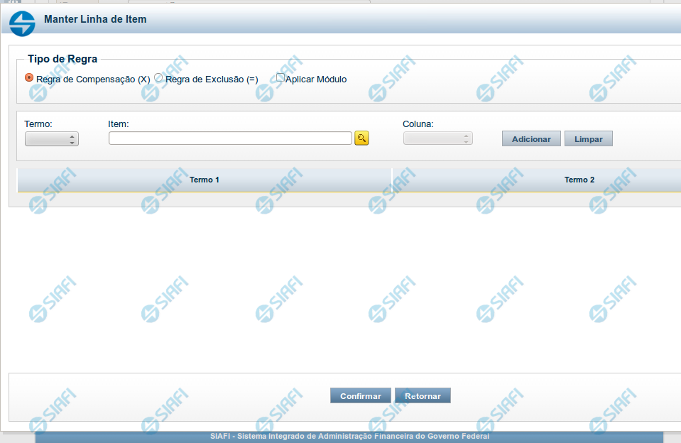Tipo de Regra - neste campo você deve selecionar o tipo de Regra de Compensação (X) ou Regra de Exclusão (=) referente à linha editada.