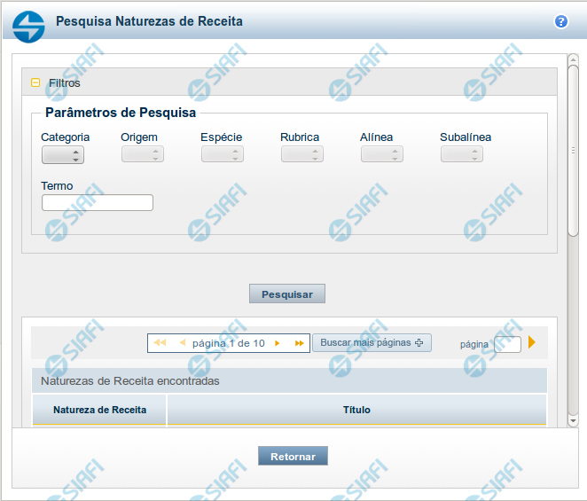 Pesquisar - Clique nesse botão para comandar a pesquisa da tabela "Natureza de Receita", atendendo aos parâmetros que você informou. Caso você não informe nenhum parâmetro, serão apresentados todos os registros da tabela.