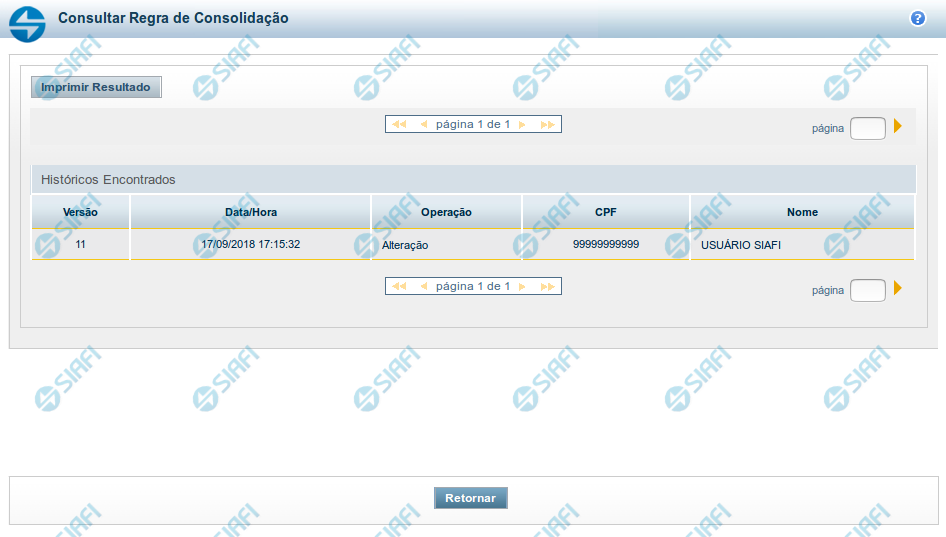 Esse formulário apresenta a lista de todos as alterações efetuadas sobre uma regra de consolidação. Selecione uma linha para detalhar a operação realizada.