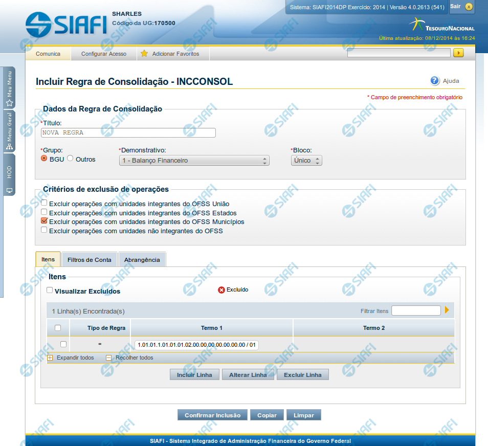 Incluir Regra de Consolidação - Aba: Itens