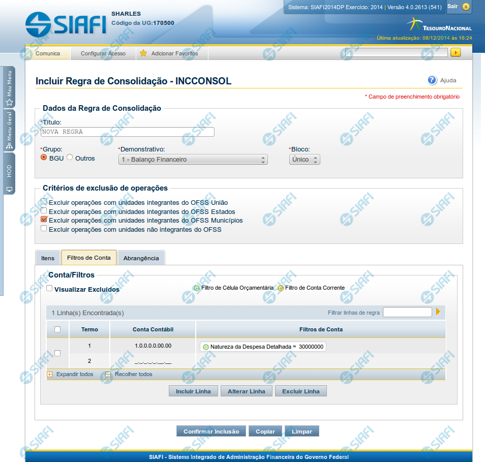 Incluir Regra de Consolidação - Aba: Filtros de Conta