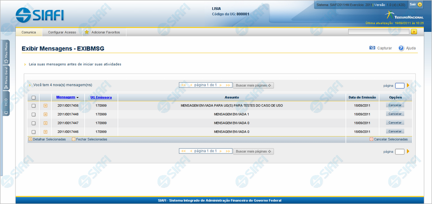 Comunica - aba Comunica exibida na lista das mensagens destinadas aos usuários do sistema que pertencem à sua Unidade Gestora. Clique no símbolo "+" que antecede uma dada mensagem para visualizar o seu conteúdo ou no símbolo "-" para ocultá-lo. Você pode também eliminar uma mensagem da sua caixa pessoal, clicando no botão "Cancelar" correspondente.