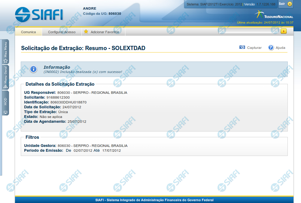 sobre o resultado do cadastramento da Solicitação de Extração de Dados.
