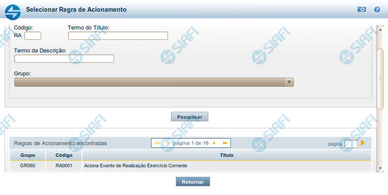 Regras de Acionamento encontradas - Tabela contendo a lista de registros retornados na