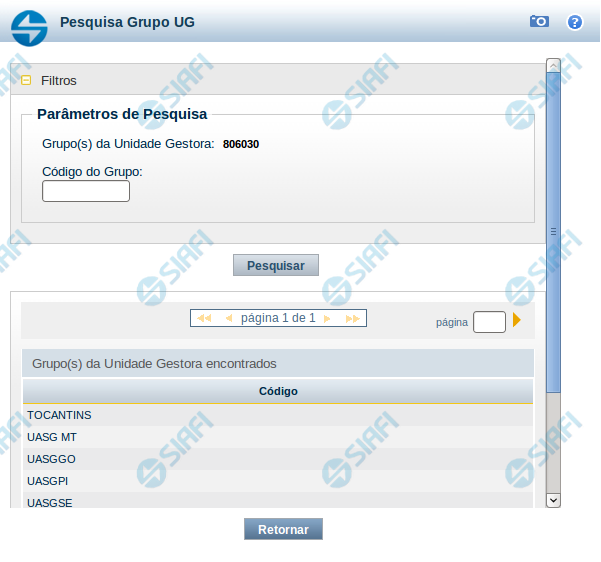 Para consultar a tabela "Grupo UG", informe o código do Grupo ou alguns caracteres iniciais do código do Grupo e clique no botão "Pesquisar".