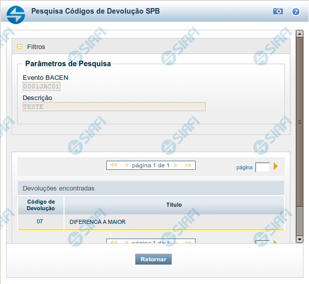 Pesquisar - Clique nesse botão para comandar a pesquisa da tabela "Códigos de Devolução SPB ", atendendo aos parâmetros que você informou. Caso você não informe nenhum parâmetro, serão apresentados todos os registros da tabela.