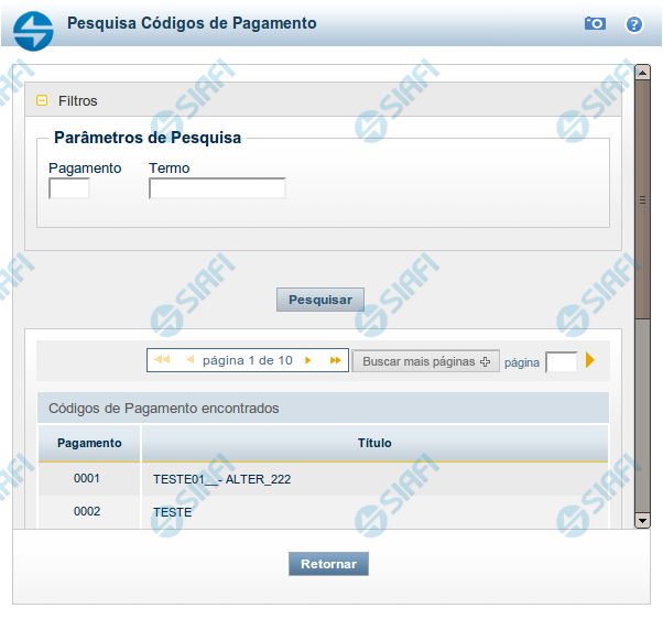 Para pesquisar a tabela "Códigos de Pagamento", preencha os campos do bloco "Filtros" e clique no botão "Pesquisar".
