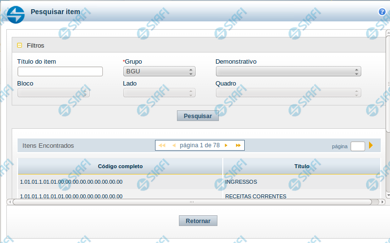 Itens encontrados – Tabela contendo a lista de registros retornados pela pesquisa, constituída pelas colunas descritas a seguir. Clique em um dos campos dessa lista para selecionar o registro desejado.