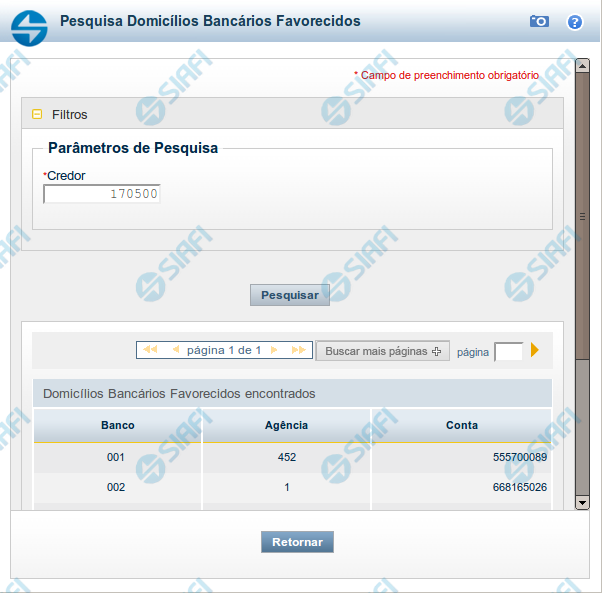 Domicílios Bancários Favorecidos encontrados - Tabela contendo a