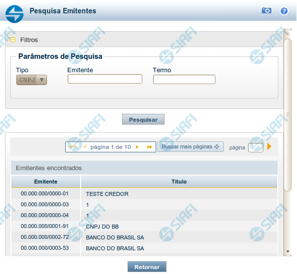 Emitentes encontrados - Tabela contendo a lista de registros