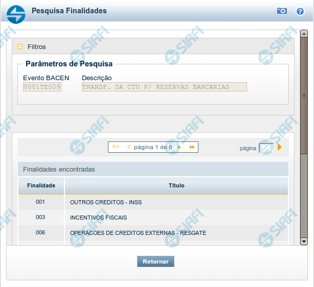 O resultado da pesquisa é uma lista de Finalidades que atende aos parâmetros especificados. Clique em um campo dessa lista para selecionar o registro desejado.
