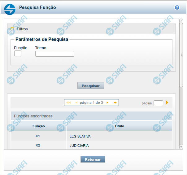 Funções encontradas - Tabela contendo a lista de registros retornados pela pesquisa, constituída pelas colunas descritas a seguir. Clique em um dos campos dessa lista para selecionar o registro desejado.