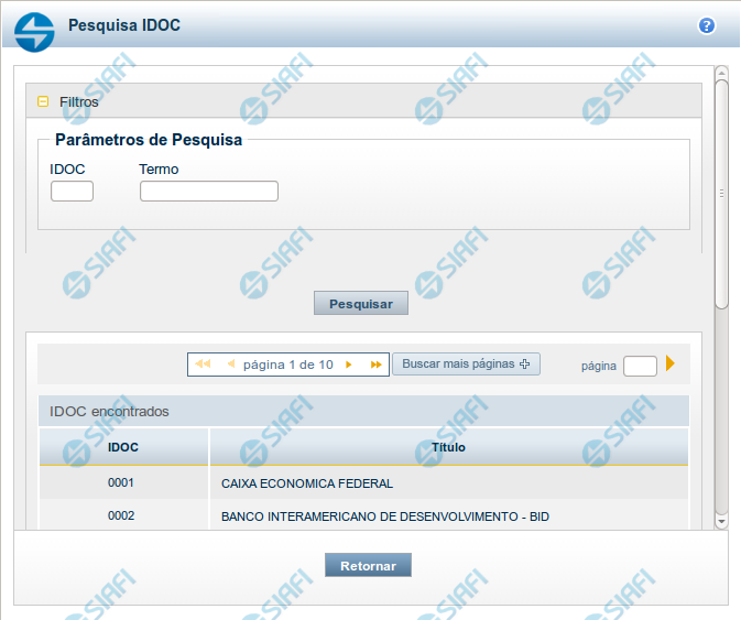 Para pesquisar a tabela "IDOC" (Identificador de Doação e Operação de Crédito) preencha os campos do bloco "Filtros" e clique no botão "Pesquisar".