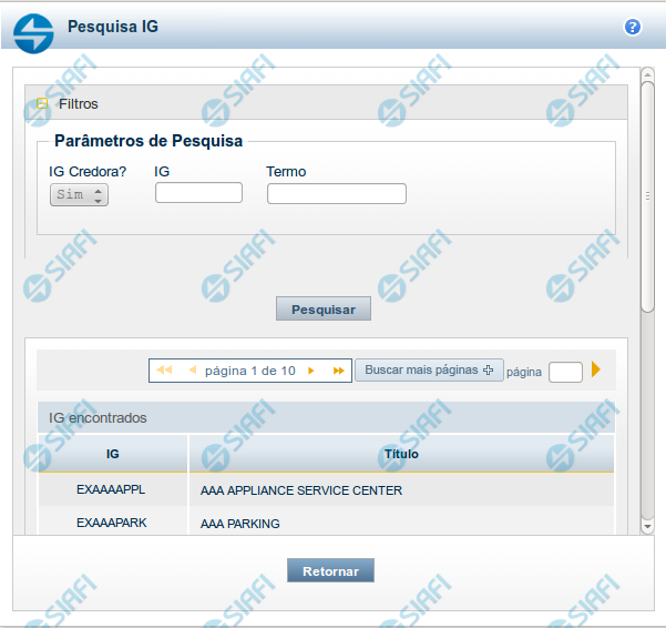 IG encontrados - Tabela contendo a lista de registros retornados pela pesquisa, constituída por duas colunas, descritas a seguir. Clique em um dos campos dessa lista para selecionar o registro desejado.
