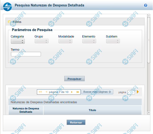 Pesquisar - Clique nesse botão para comandar a pesquisa da tabela "Natureza de Despesa Detalhada", atendendo aos parâmetros que você informou. Caso você não informe nenhum parâmetro, serão apresentados todos os registros da tabela.