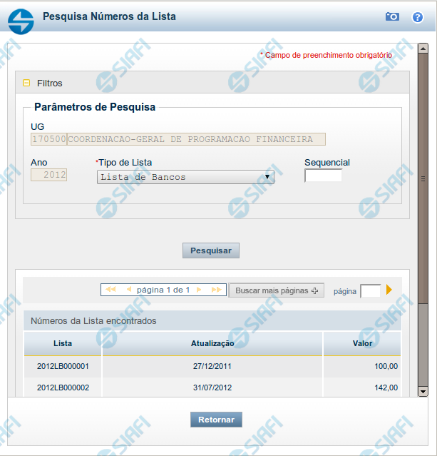 Para pesquisar a tabela "Número da Lista" (Identificadores de lista, para os diversos tipos de listas associadas aos Documentos SIAFI), preencha os campos do bloco "Filtros" e clique no botão "Pesquisar".
