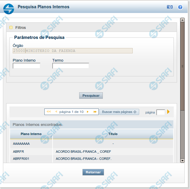 Para pesquisar a tabela "Planos Internos" (Planos associados ao Orçamento de um Órgão), preencha os campos do bloco "Filtros" e clique no botão "Pesquisar".