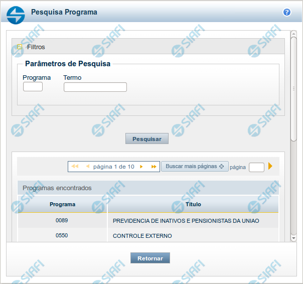 Para pesquisar a tabela "Programas", preencha os campos do bloco "Filtros" e clique no botão "Pesquisar".