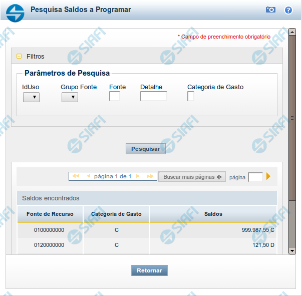 O resultado da pesquisa é uma lista de saldos monetários a programar correspondentes a combinações dos campos "Fontes de Recurso" e "Categoria de Gasto", que atendem aos parâmetros especificados. Clique em um campo dessa lista para selecionar o registro desejado.