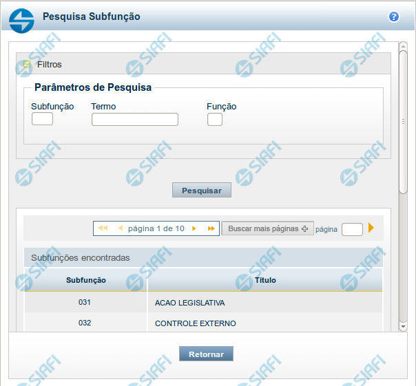 Pesquisar - Clique nesse botão para comandar a pesquisa da tabela "Subfunções", atendendo aos parâmetros que você informou. Caso você não informe nenhum parâmetro, serão apresentados todos os registros da tabela.