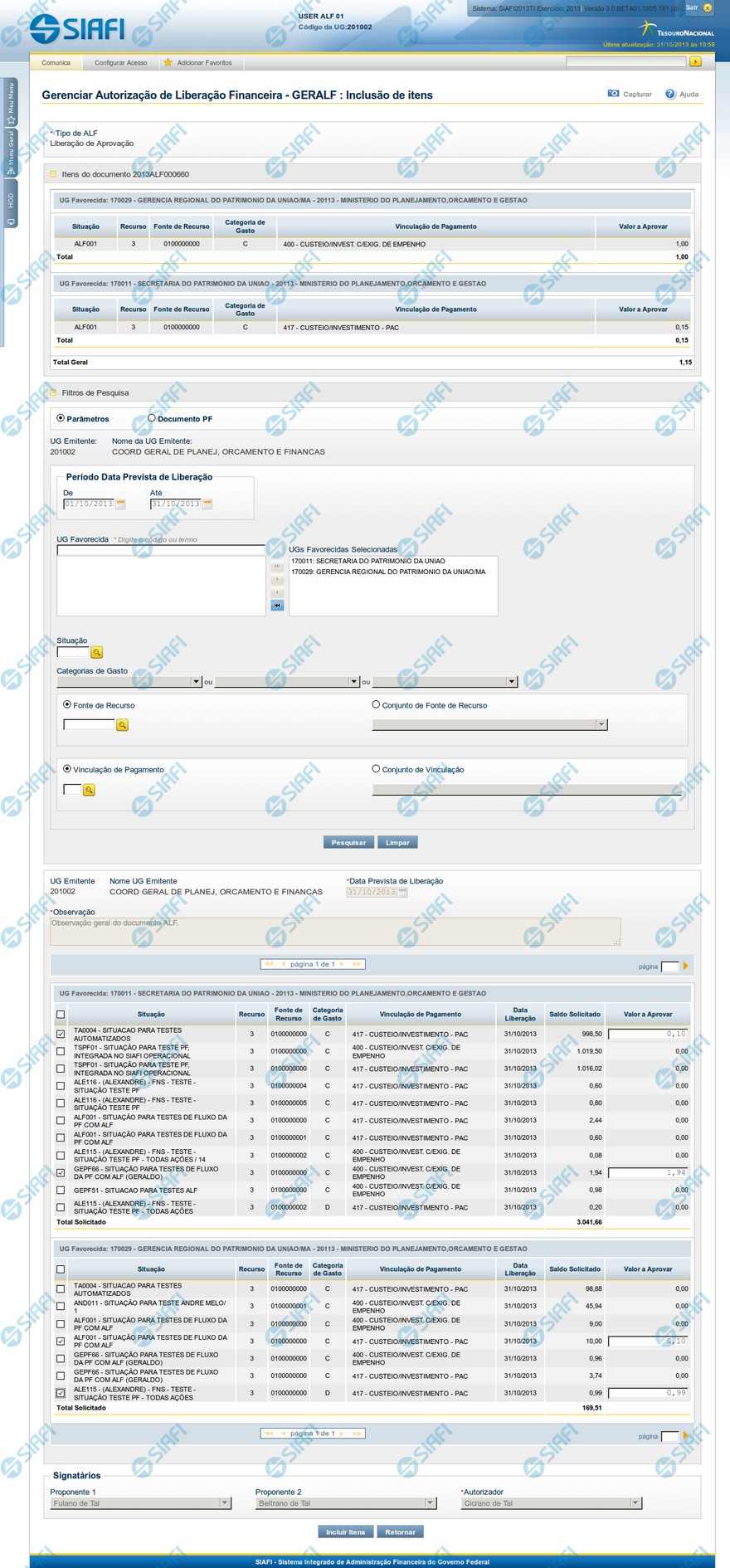 Para incluir itens em um documentos ALF já existentes, o sistema incorpora, no formulário da funcionalidade GERALF, o mesmo formulário que é apresentado pela funcionalidade INCALF para o tipo especifico de ALF do documento detalhado.