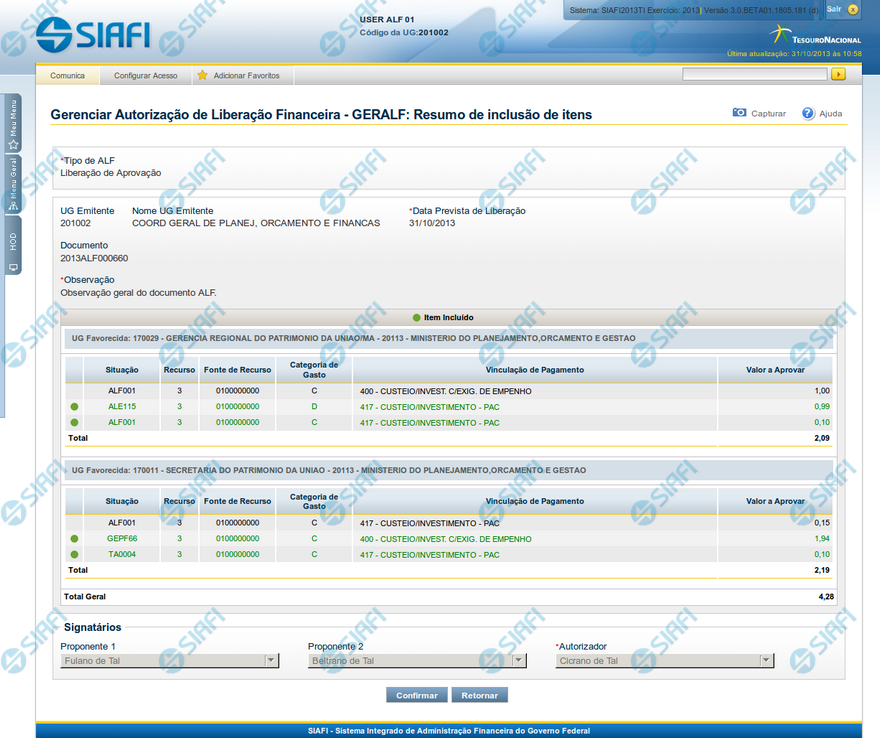 Os itens incluídos no documento ALF são agrupados conforme os dados da UG Favorecida que possuem, e são destacados visualmente na tela.