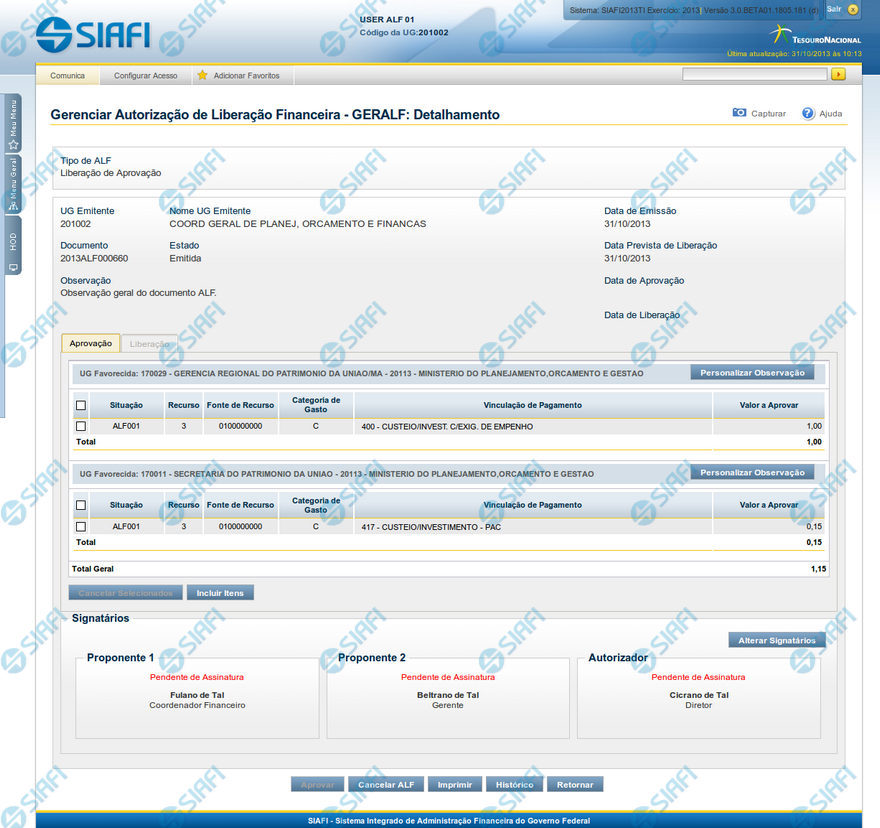 Há três tipos de signatários que podem ser associados ao documento ALF: "Proponente 1", "Proponente 2" e "Autorizador". Para cada um dos possíveis signatários de um documento ALF, são apresentadas as informações a seguir: