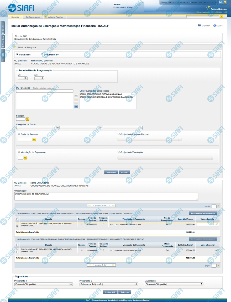 INCALF - ALF de Cancelamento de Liberação e Transferência - Resultado da pesquisa