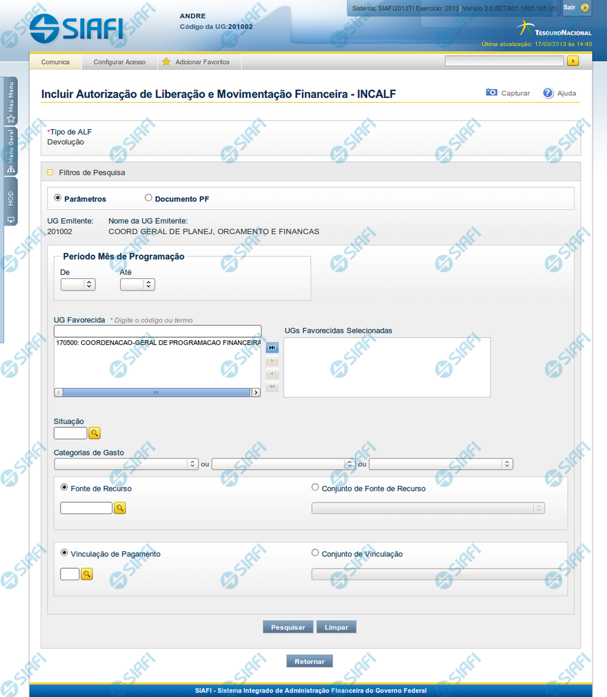 Retornar - Clique neste botão para retornar para a página de seleção do Tipo de ALF. Esta ação vai limpar os valores informados nos campos de parâmetros de pesquisa.