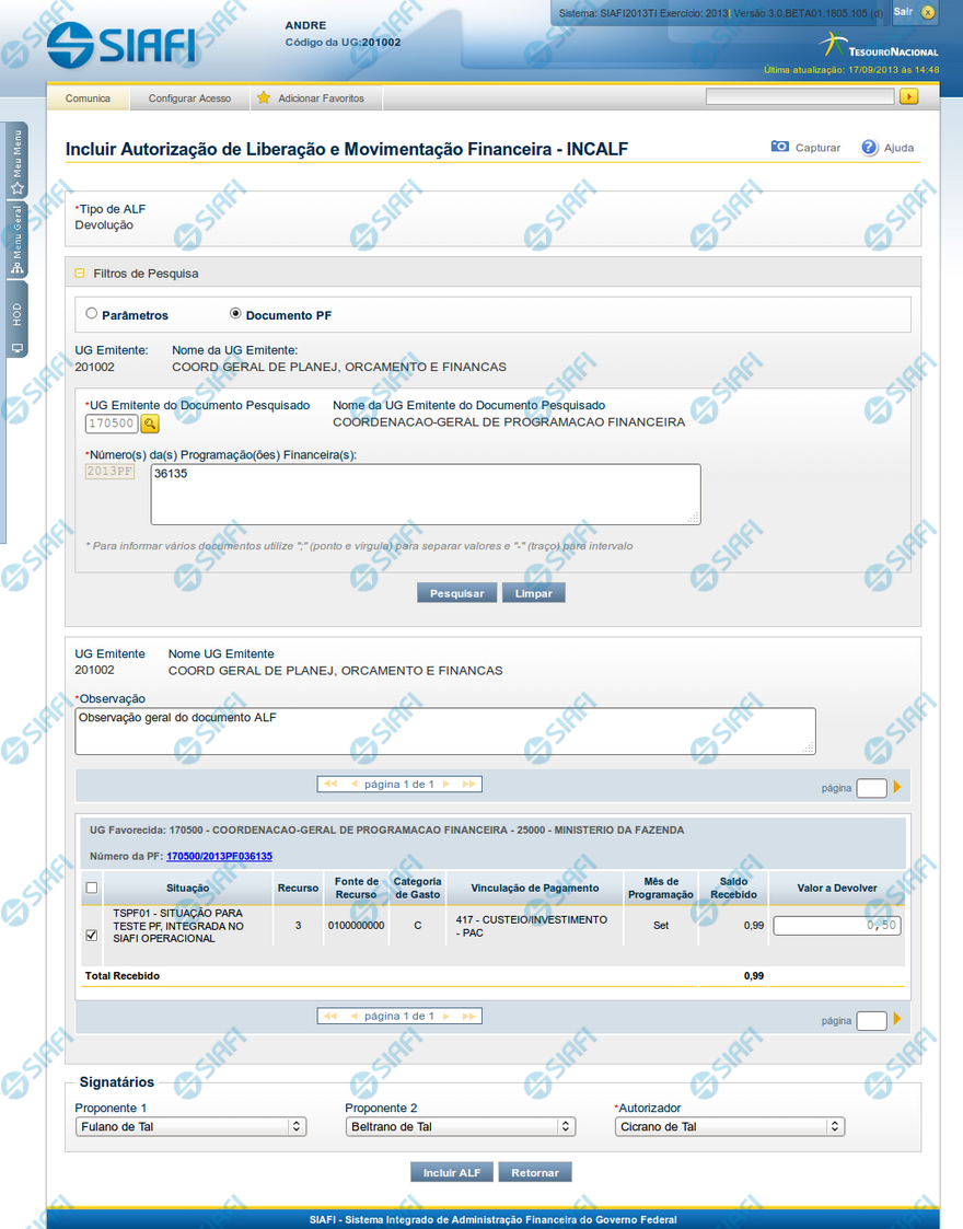 Autorizador - apresenta uma lista com os nomes dos signatários cadastrados como “Autorizador” para a UG Emitente e para o Tipo ALF no módulo Dados de Apoio.