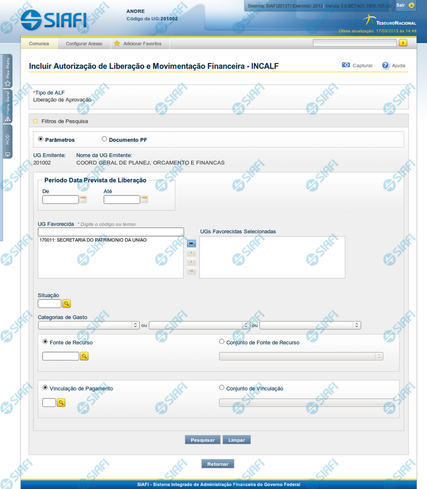 Esta tela permite definir o tipo de pesquisa desejado e fornecer os respectivos parâmetros de busca que facilitarão a localização e seleção dos itens de PF a serem incluídos na ALF a ser criada.