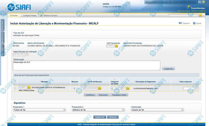 Autorizador - apresenta uma lista com os nomes dos signatários cadastrados como “Autorizador” para a UG Emitente e para o Tipo ALF no módulo Dados de Apoio.