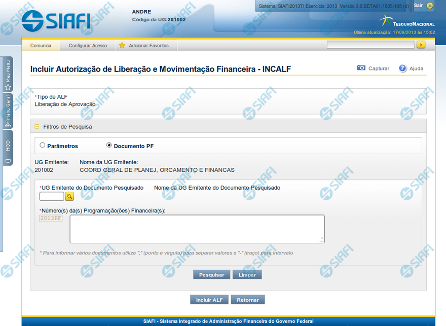 Documento PF - permite que a pesquisa seja feita diretamente a partir da informação dos números de um ou mais documentos de Programação Financeira. Marque este campo quando possuir o número do(s) documento(s) PF que contém os itens a serem incluídos na ALF. O resultado desta pesquisa será agrupado pelo conjunto de dados UG Favorecida + Documento PF recuperados.